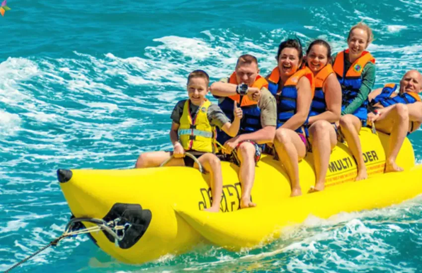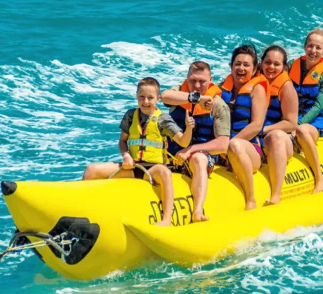 - После пустынной части программы группа отправляется к морю, где предусмотрено групповое катание на банане (по 5–6 человек);