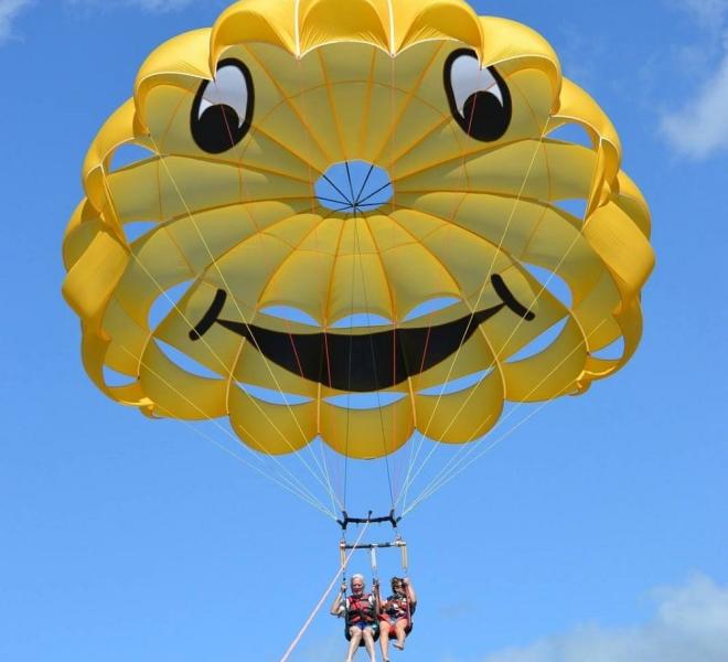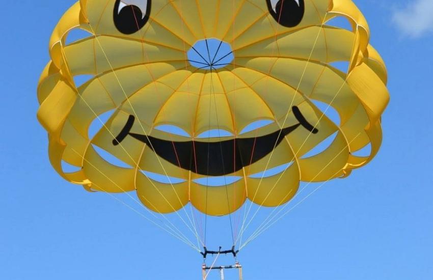 - Затем вы совершите полёт на парашюте за катером — стандартное время полёта составляет до 6 минут;